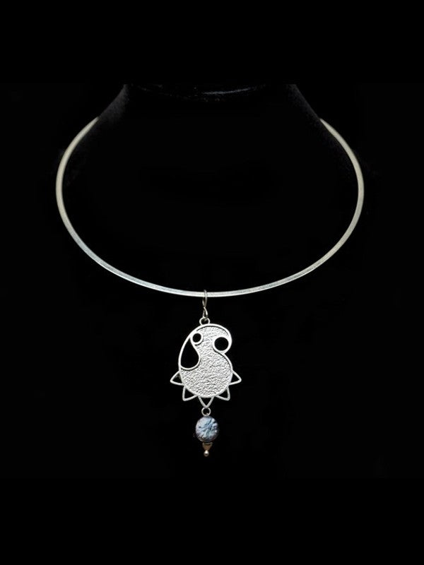 The pendant with its hi-shine edges and textured base is accentuated with your choice of grey/ white coin pearl. It is attached to a handcrafted flat neck collar.