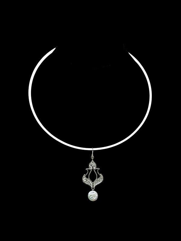 The pendant with its hi-shine edges and textured base is accentuated with your choice of grey/ white coin pearl. It is attached to a handcrafted flat neck collar.