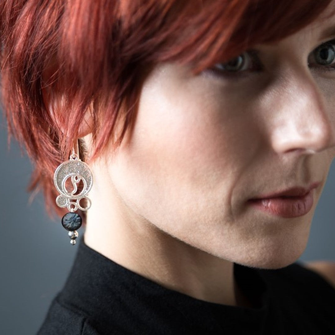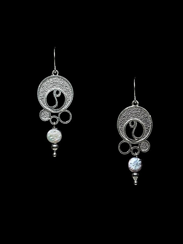 The handcrafted dangler, with hi-shine edges with a textured base is accented with grey and white coin pearl.