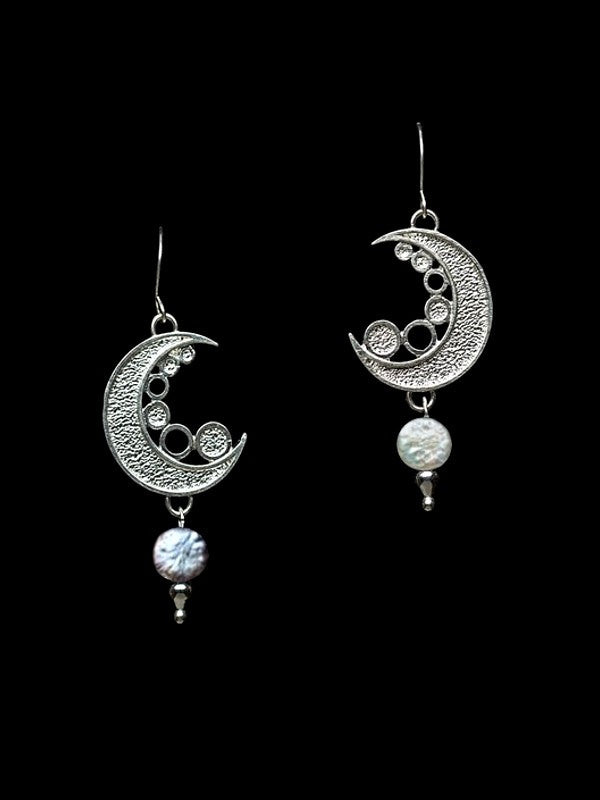 The handcrafted dangler, with hi-shine edges with a textured base is accented with grey and white coin pearl.