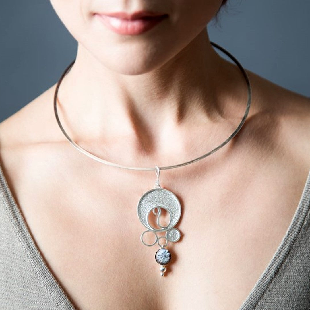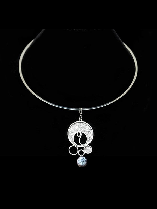 The pendant with its hi-shine edges and textured base is accentuated with your choice of grey/ white coin pearl. It is attached to a handcrafted flat neck collar.