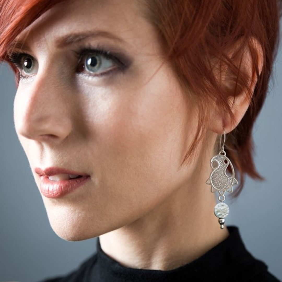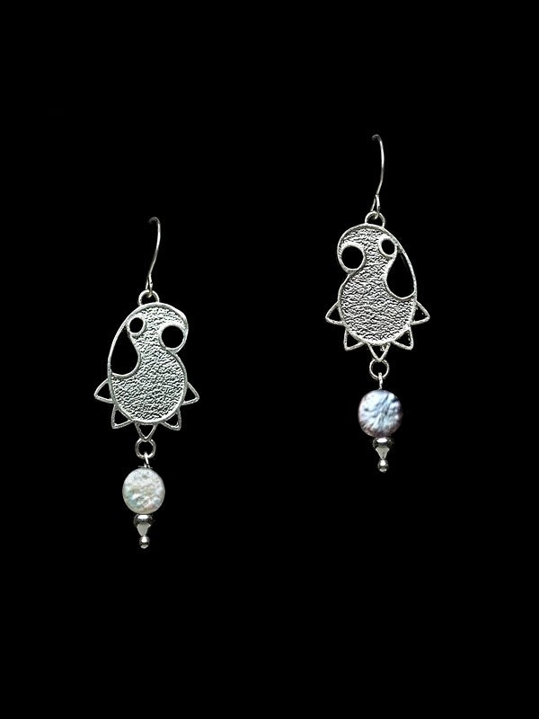 The handcrafted dangler, with hi-shine edges with a textured base is accented with grey and white coin pearl.