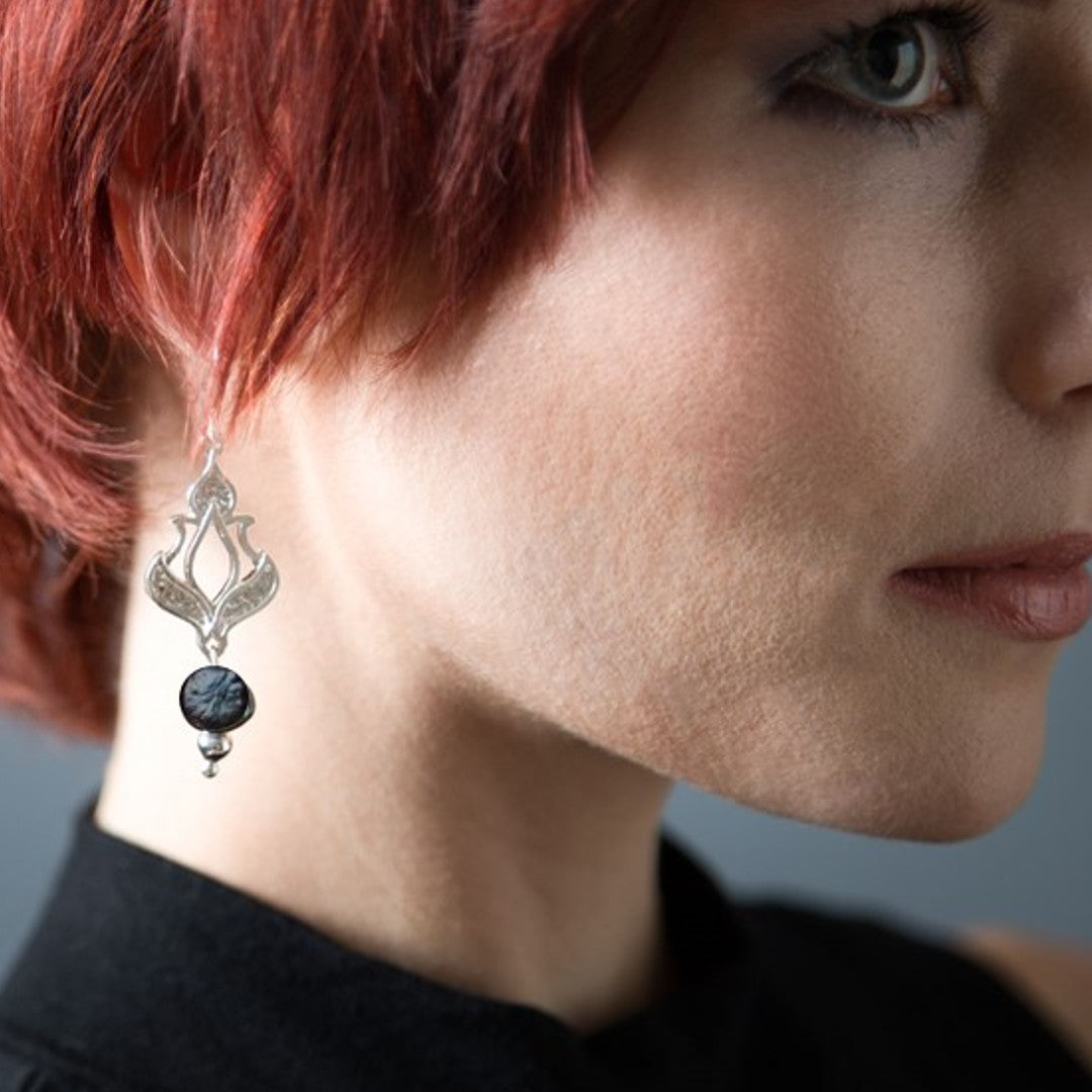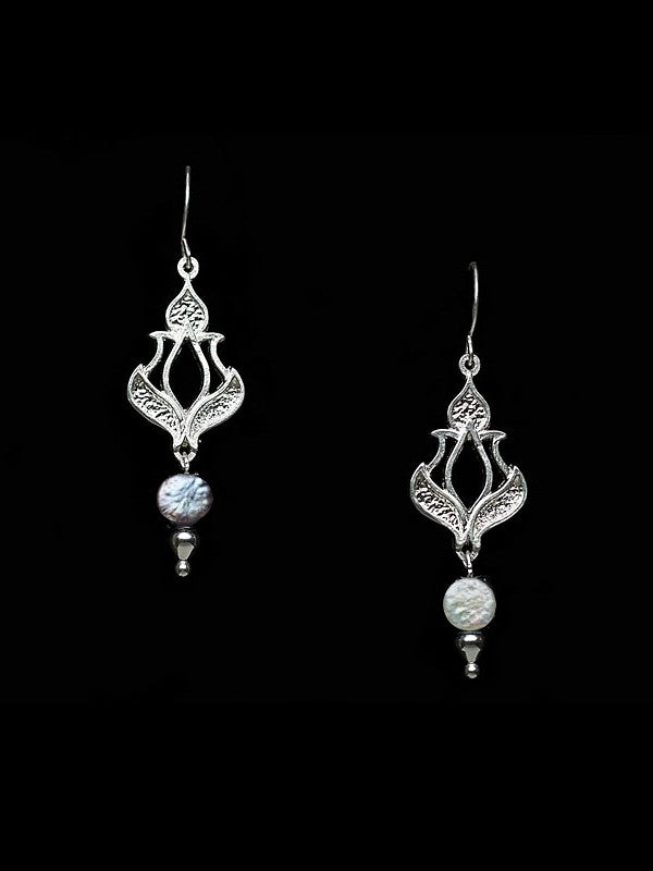 The handcrafted dangler, with hi-shine edges with a textured base is accented with grey and white coin pearl.