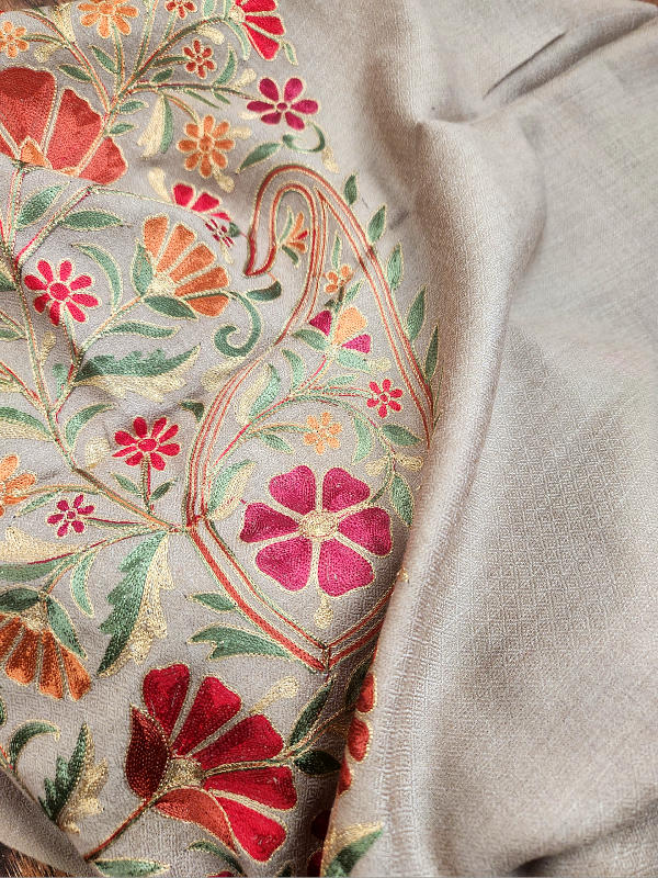 This elegant woolen wrap - stole woven in fine wool and elaborate paisley embroidery with color threads and zari on both ends of the stole on a dust brown pashmina wool base is extreme stylish. It is graceful and has a comfortable soft warm drape that cocoons you in its warmth. The stole is long and can be used as a shawl or even an oversized scarf.