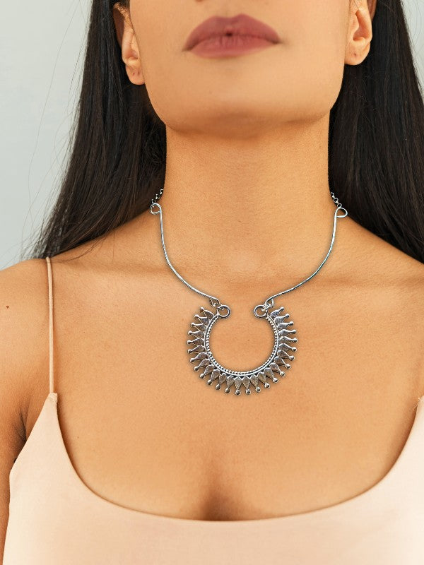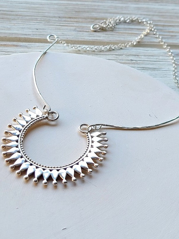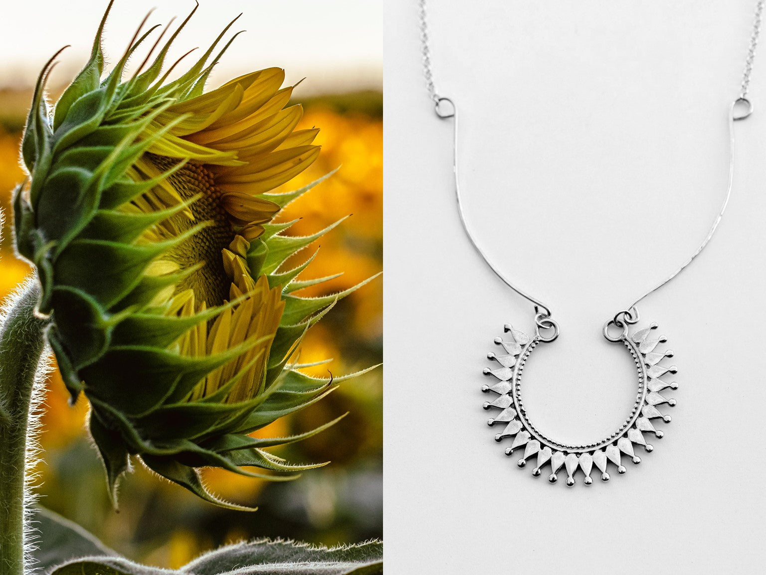 Inspired by the sunflowers this handcrafted sterling silver hi-shine semi collar neckpiece with the statement pendant comes with an adjustable chain that enables you to increase or decrease the length to your liking. Elegant yet statement.