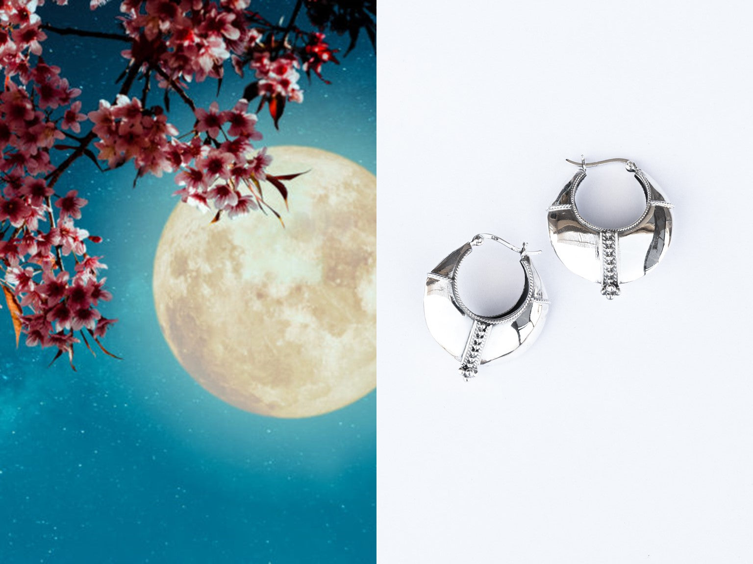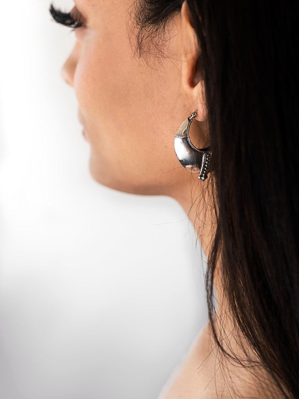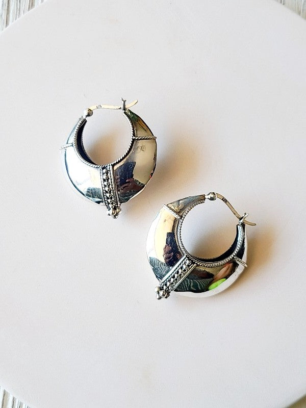 Inspired by the moon these handcrafted hi-shine sterling silver hoop earrings are are stunner. They are of substantial weight while also comfortable to the ear. Statement yet very comfortable.