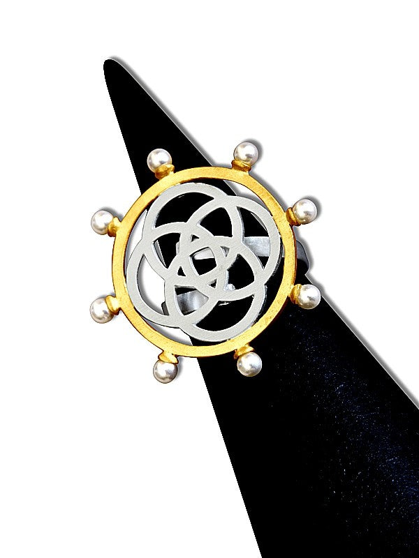 The Jamiti statement ring designed with circles in different sizes ,accented with pearls has a unique two-tone brush finish – sterling silver and 18K gold plated.
