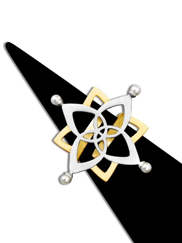 The Jamiti statement ring designed with circles in different sizes ,accented with pearls has a unique two-tone brush finish – sterling silver and 18K gold plated.