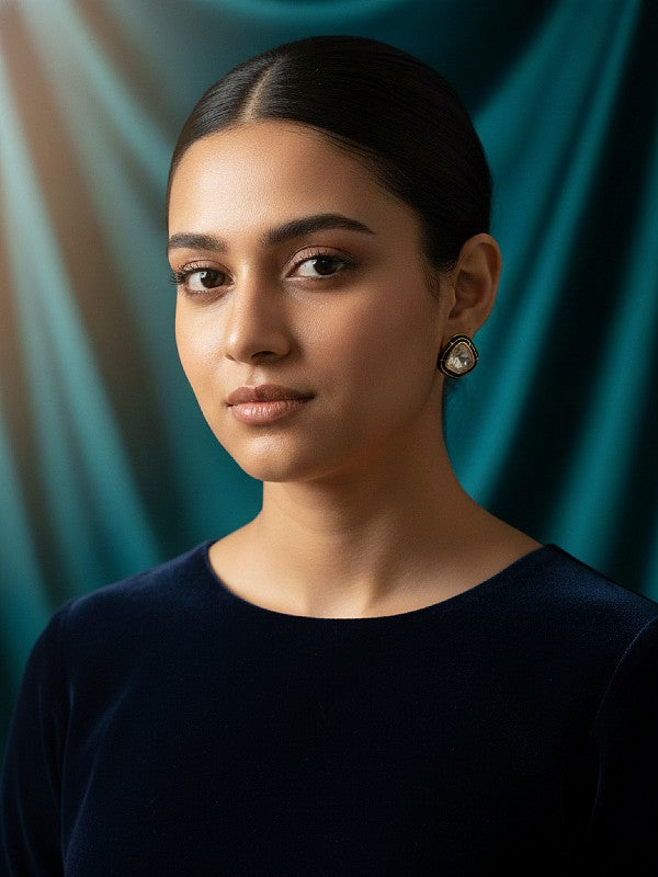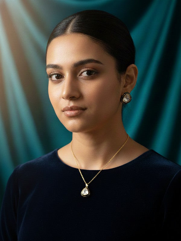 Handcrafted in luminous .925 sterling silver and plated in 22k gold, the Noora set features a bold moissanite nugget encased in enamel with a detailed filigree back, hung on a delicate 925 and 22k plated gold chain. Lightweight, comfortable, and designed to shine, the necklace comes with matching earrings for a complete look. Minimal, striking, and timeless—this Noora moissanite jewelry set is designed to elevate any ensemble with effortless shine.—perfect with both western and traditional attire.