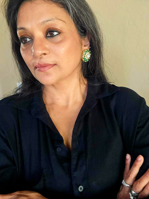 Handcrafted in .925 sterling silver and set with moissanite, these oversized Noora studs feature a radiant center stone, petal-like simulated emeralds, and sparkling CZ accents. Bold, elegant, and timelessly royal.