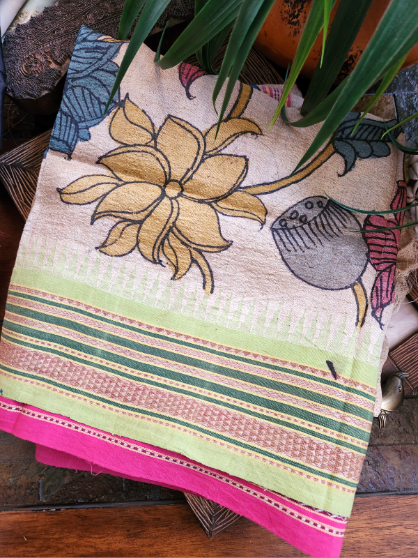 Genuine pen hand drawn kalamkari on handloom Vidharba pure silk tussar dupatta. Natural colors are used to paint on this dupatta. The Ganga Jamuna border of the Vidharbas are woven in cotton with the rich tussar silk body. The Vidharba sarees are completey handwoven and take 10 -15 days for completion of each.