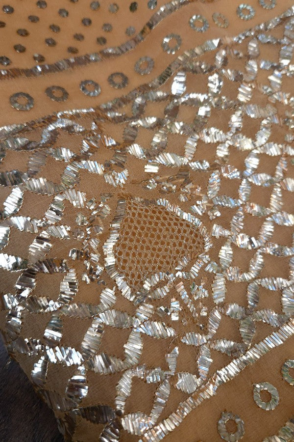 A gorgeous, warm sandalwood pure organza kamdani saree, glowing with understated luxury. The palla is richly adorned with intricate kamdani work, including the highly coveted gold-thread jaal that adds a touch of opulence. Uniform mukaish dots scattered across the body lend the saree a soft, luminous richness. It comes with a matching blouse piece—an effortlessly elegant ensemble.