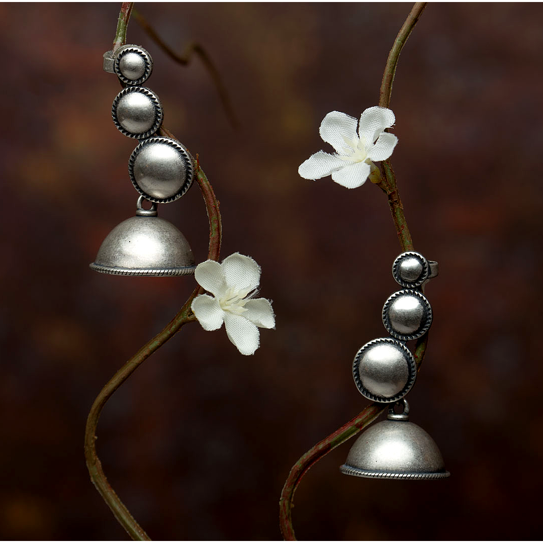 This handcrafted ear cuff is made in a modular style. Styled with an ethnic Indian touch the jhumki ( bell) can be removed with ease or worn with it as a complete statement ear accessory. The Sai chakra ear cuff is crafted with sterling silver and an oxidized finish, makes for a statement ear accessory – delicate yet elegant.