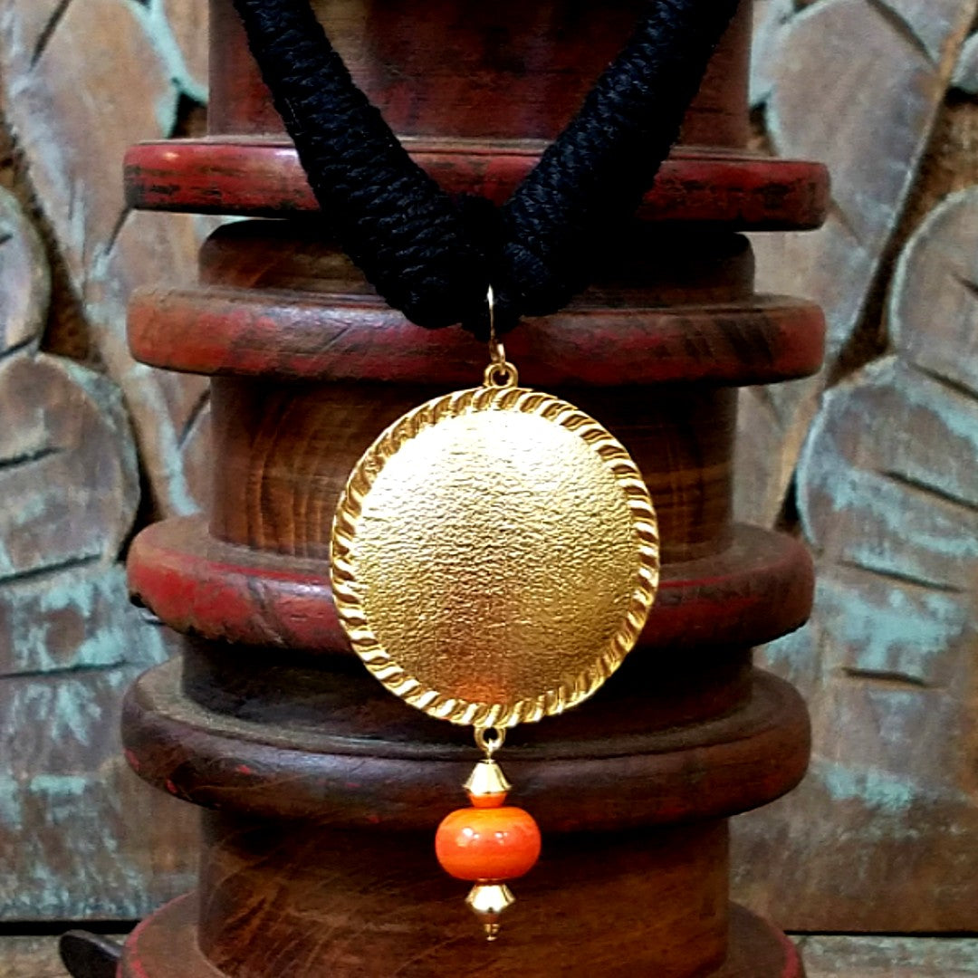 This handcrafted neckpiece with the Chakra pendant is attached to a woven black cord to give it the neutral look. The pendant has has a beaten and a textured finish. The pendant is accentuated with a hand blown Turkish bead drop. A simple yet statement neckpiece.