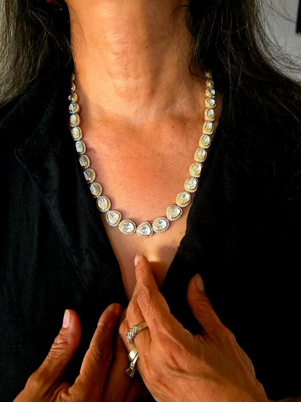 Handcrafted in luminous .925 sterling silver and plated in 22k gold, each Noora piece shines with the brilliance of moissanite. Asymmetrically placed moissanite nuggets flow organically, each haloed with delicate CZs for added sparkle. Elegant, versatile, and timeless—paired with oversized moissanite nugget studs for a perfectly coordinated statement. It carries the essence of sheer royalty and timeless grace.