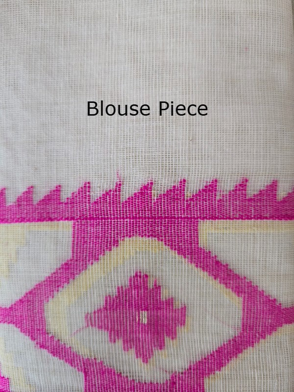 A 100-count cotton Jamdani, unique in its artistry. Four exquisite borders woven at equal intervals in vibrant hot pink and bright yellow lend a striking rhythm to its delicate body. Immaculately finished with silk tassels. Elegant and versatile, this saree is perfect for mornings or evenings alike. A weave that whispers history — timeless, delicate, and divine. Comes paired with a matching blouse piece.